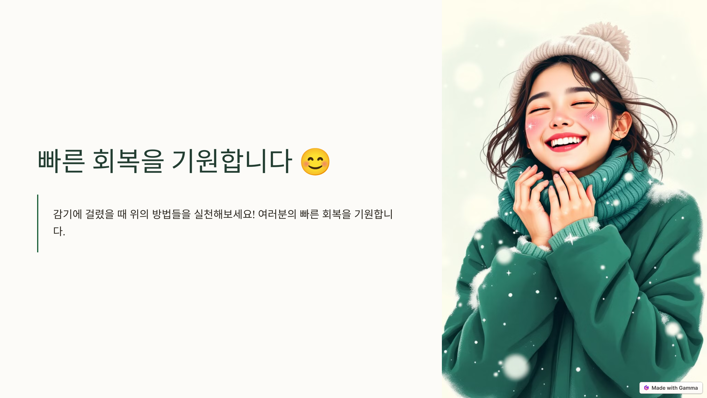 감기에 걸렸을 때 위의 방법들을 실천해보세요! 여러분의 빠른 회복을 기원합니다. 😊