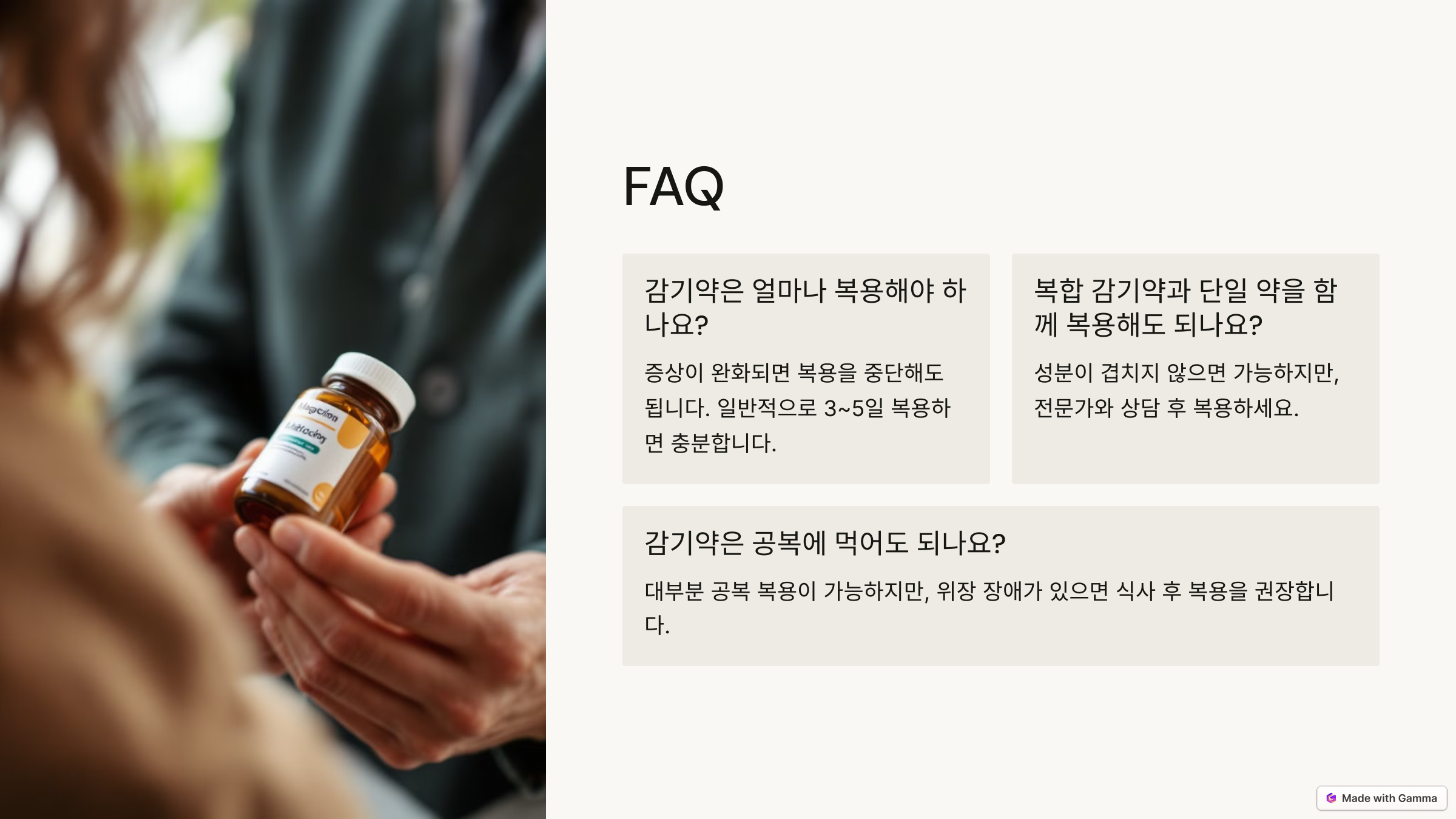 - 과다 복용 금지: 복합 감기약을 복용 중일 경우, 성분이 중복되지 않도록 주의하세요.