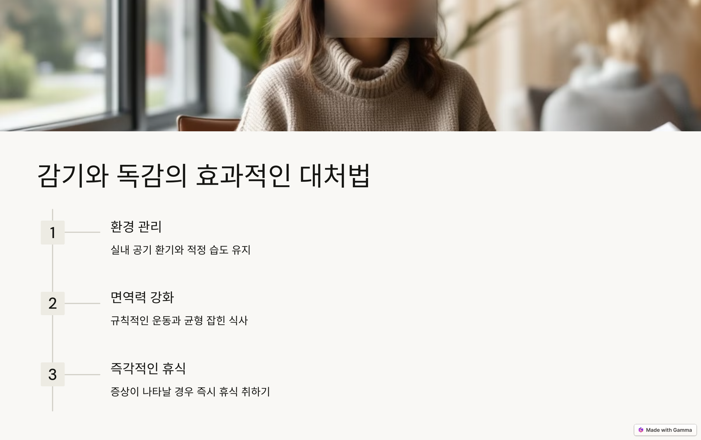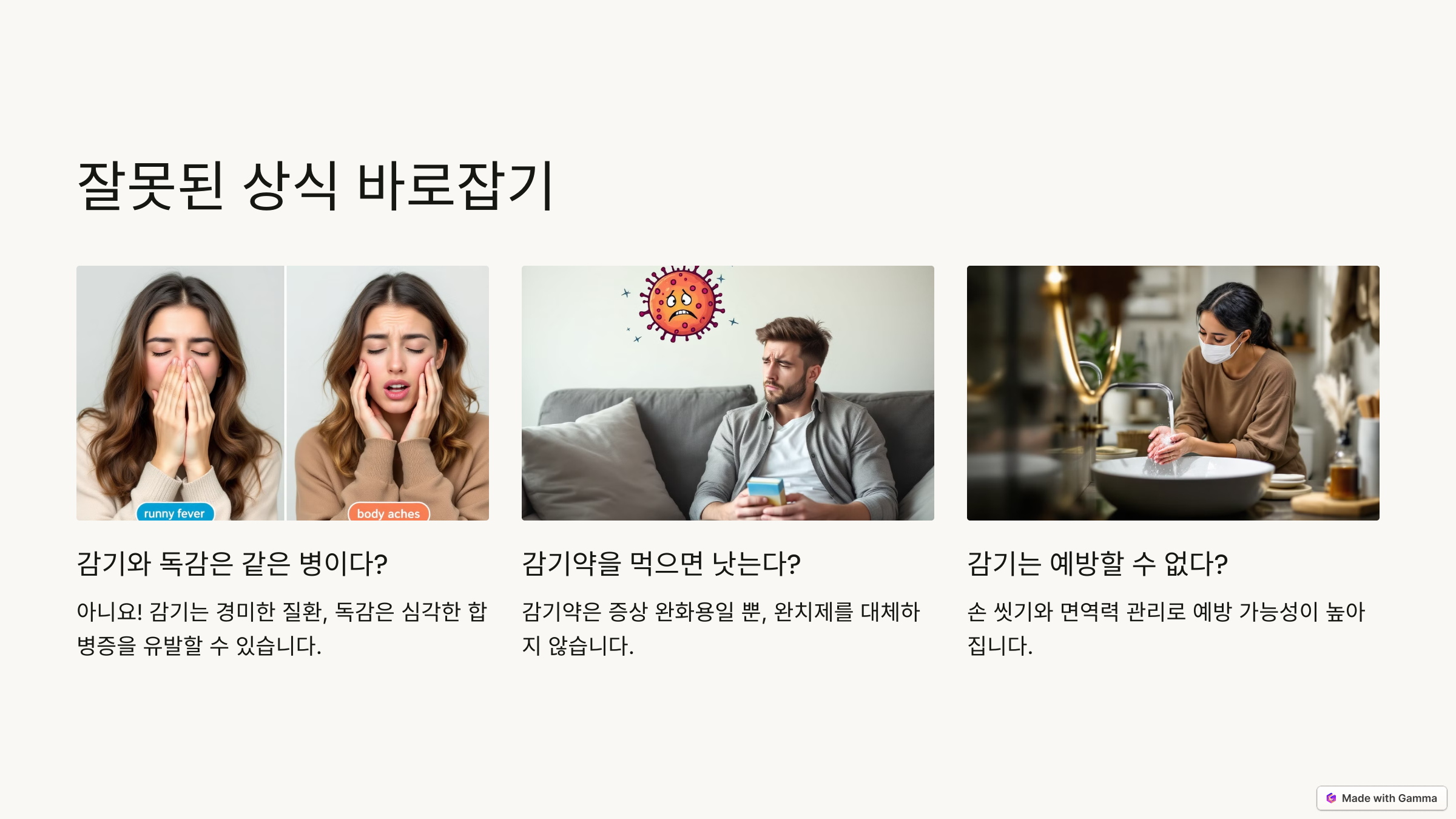 - "감기는 예방할 수 없다?" → 손 씻기와 면역력 관리로 예방 가능성이 높아집니다.