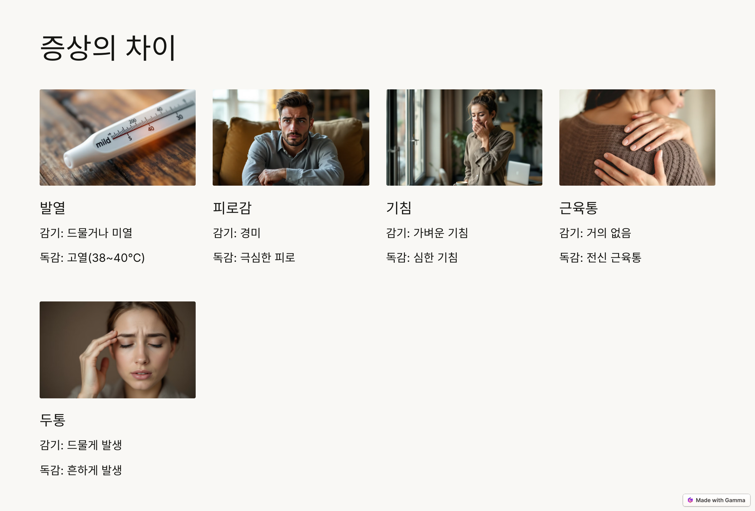 감기와 독감은 증상이 비슷하게 보일 수 있지만, 몇 가지 뚜렷한 차이점이 있습니다.