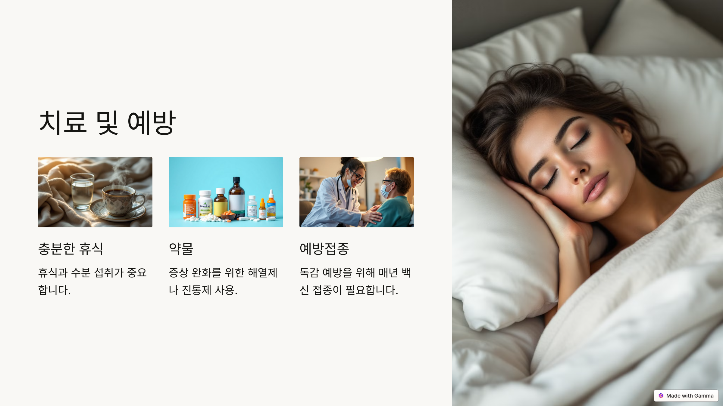 - 독감 치료: 항바이러스제(예: 오셀타미비르) 처방이 가능하며, 예방접종이 필수적입니다.